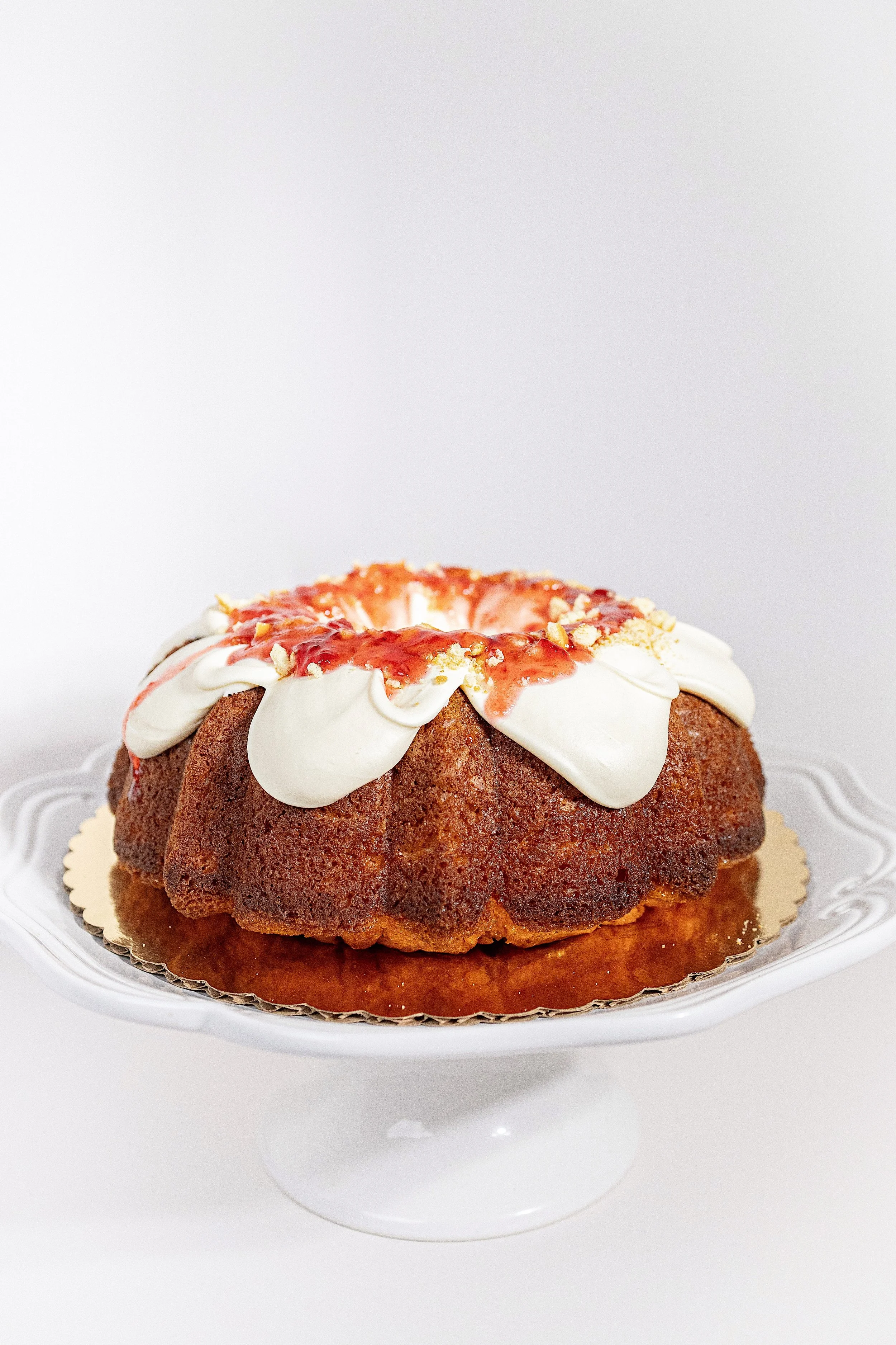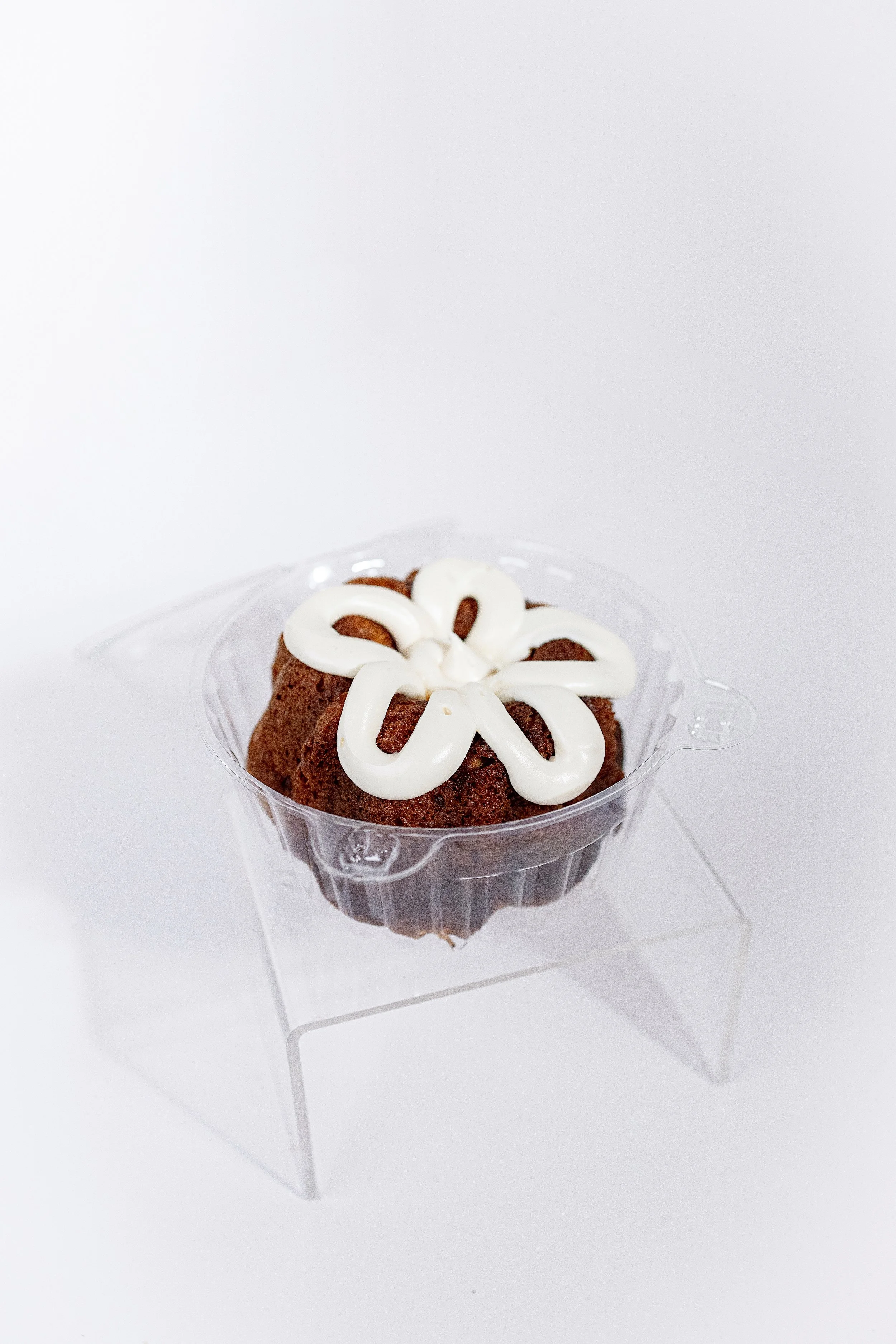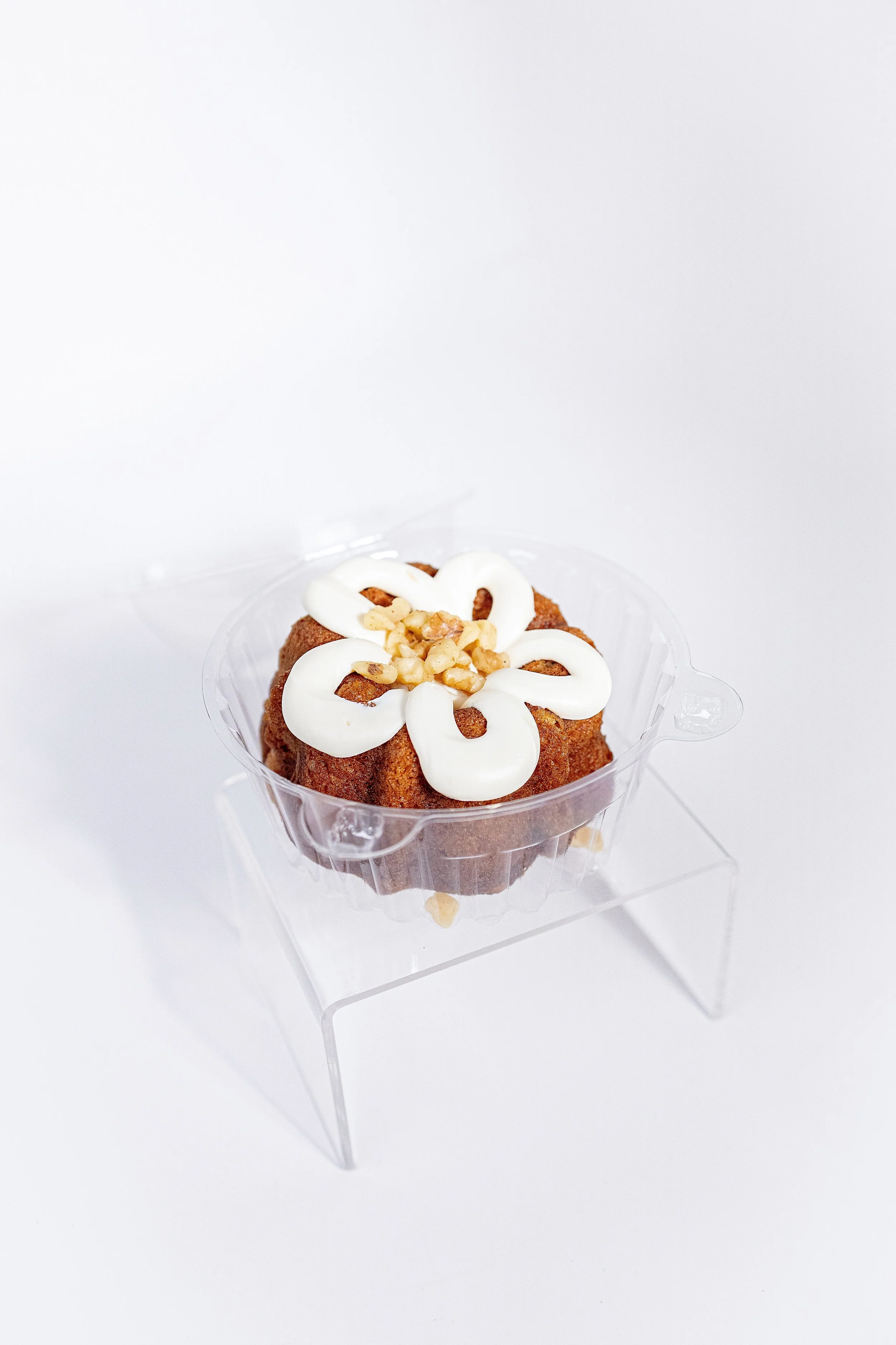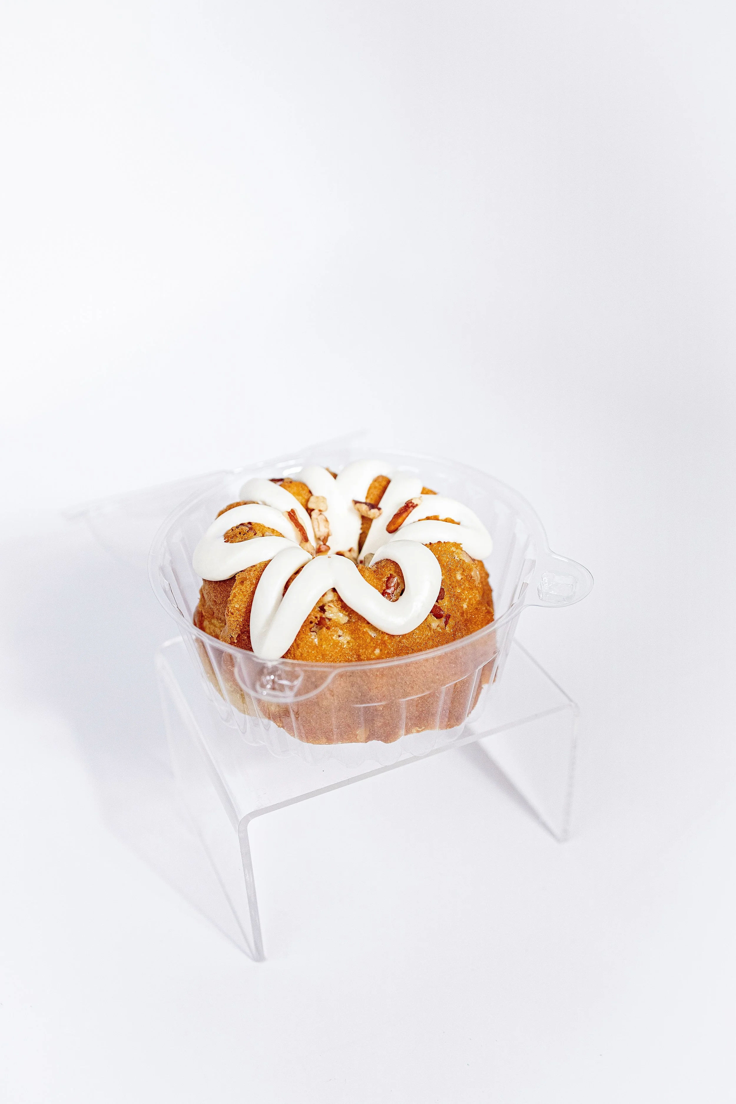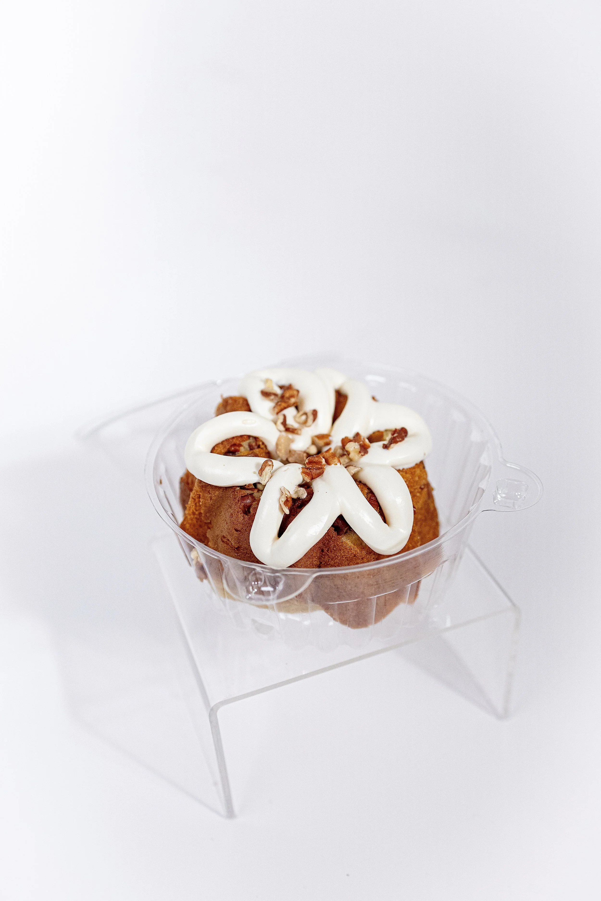 Spiced mini sweet potato cake with a crunchy pecan crust, finished with cream cheese icing for the perfect blend of smooth and nutty.