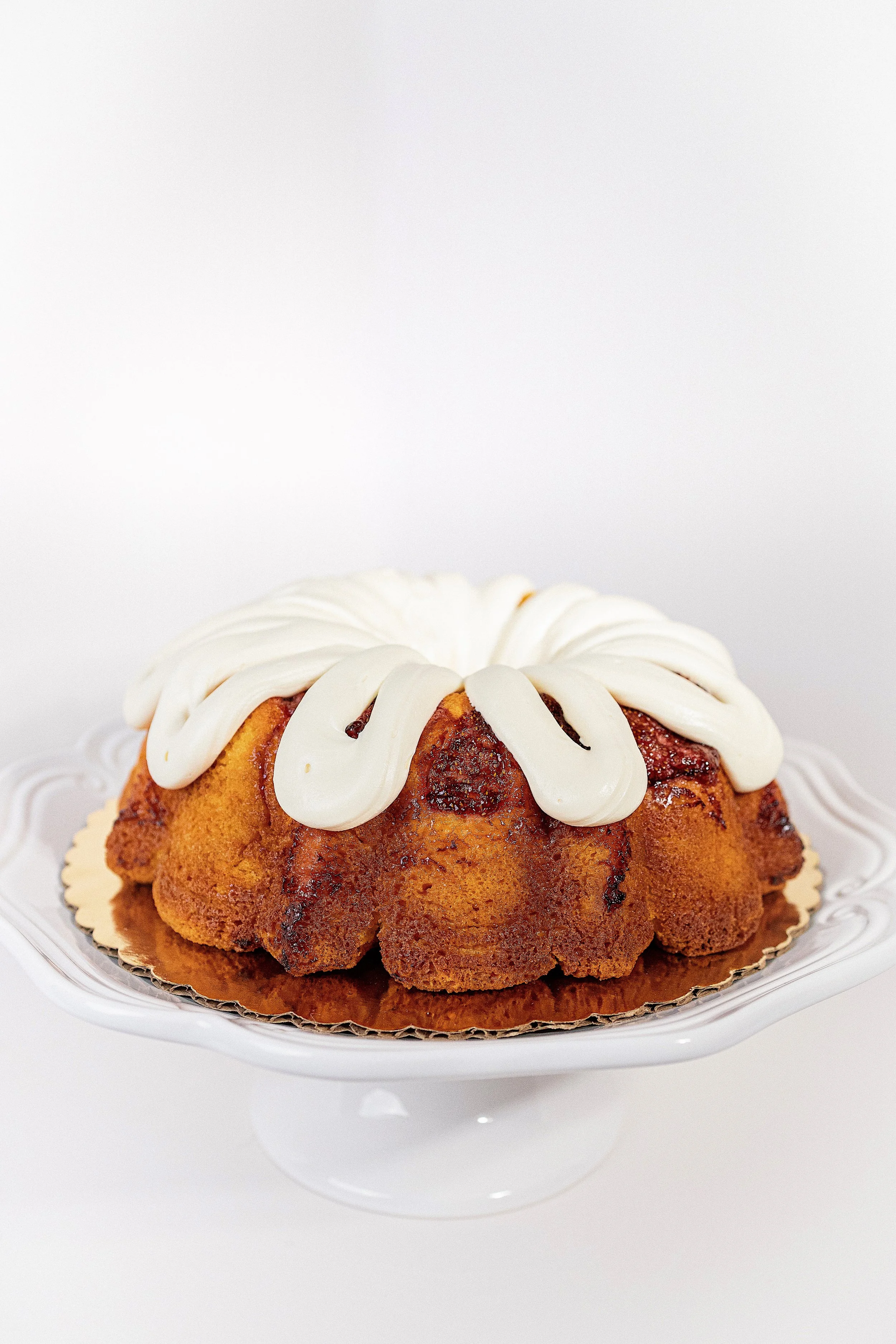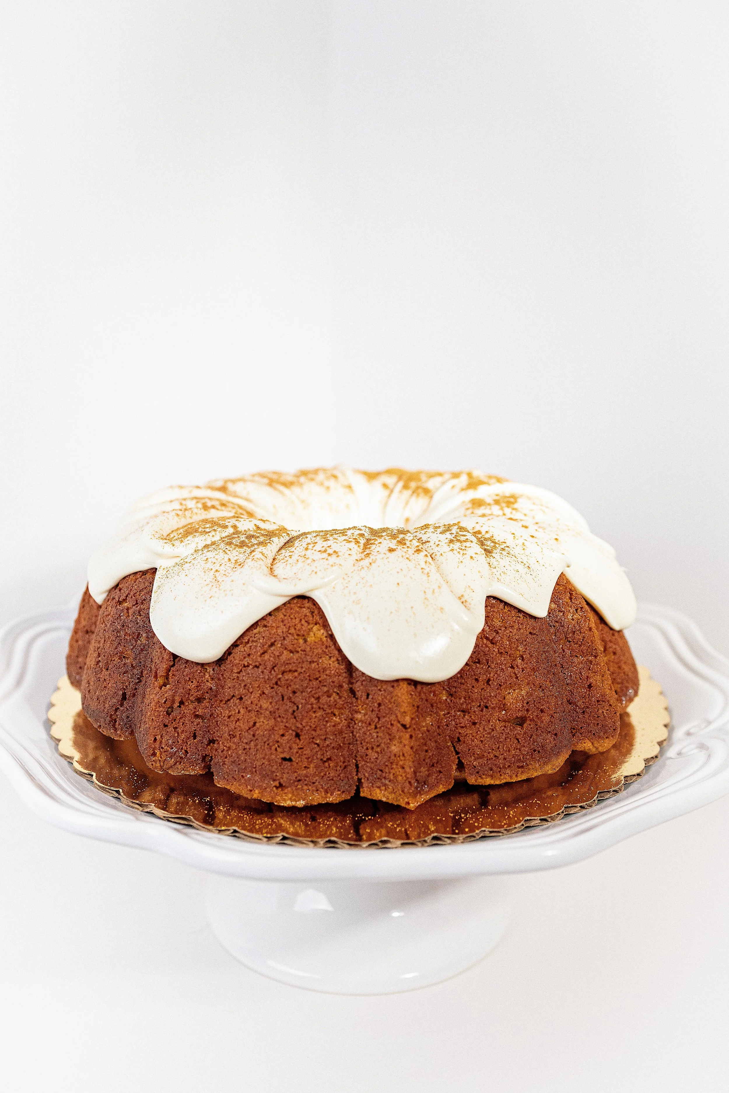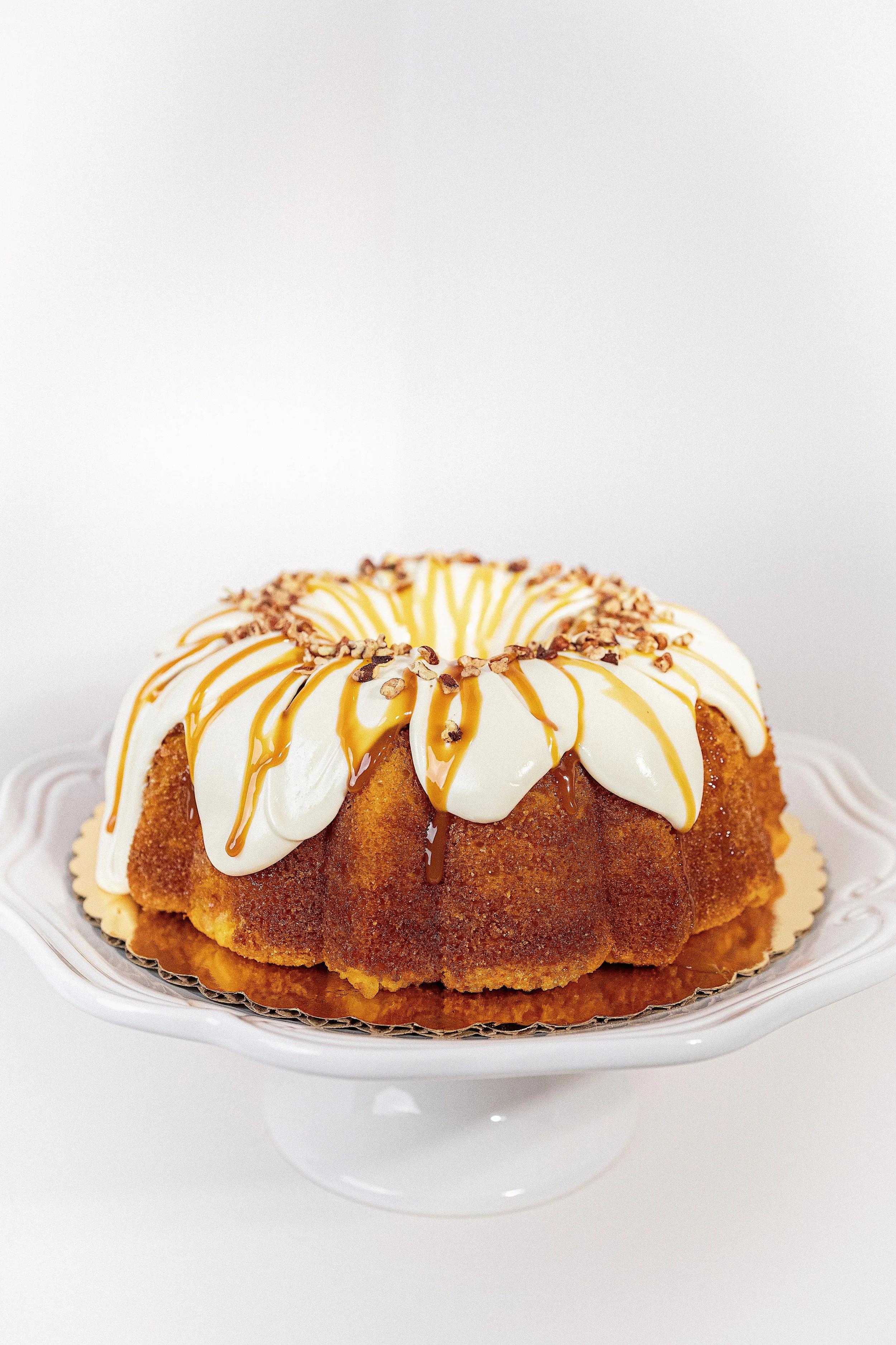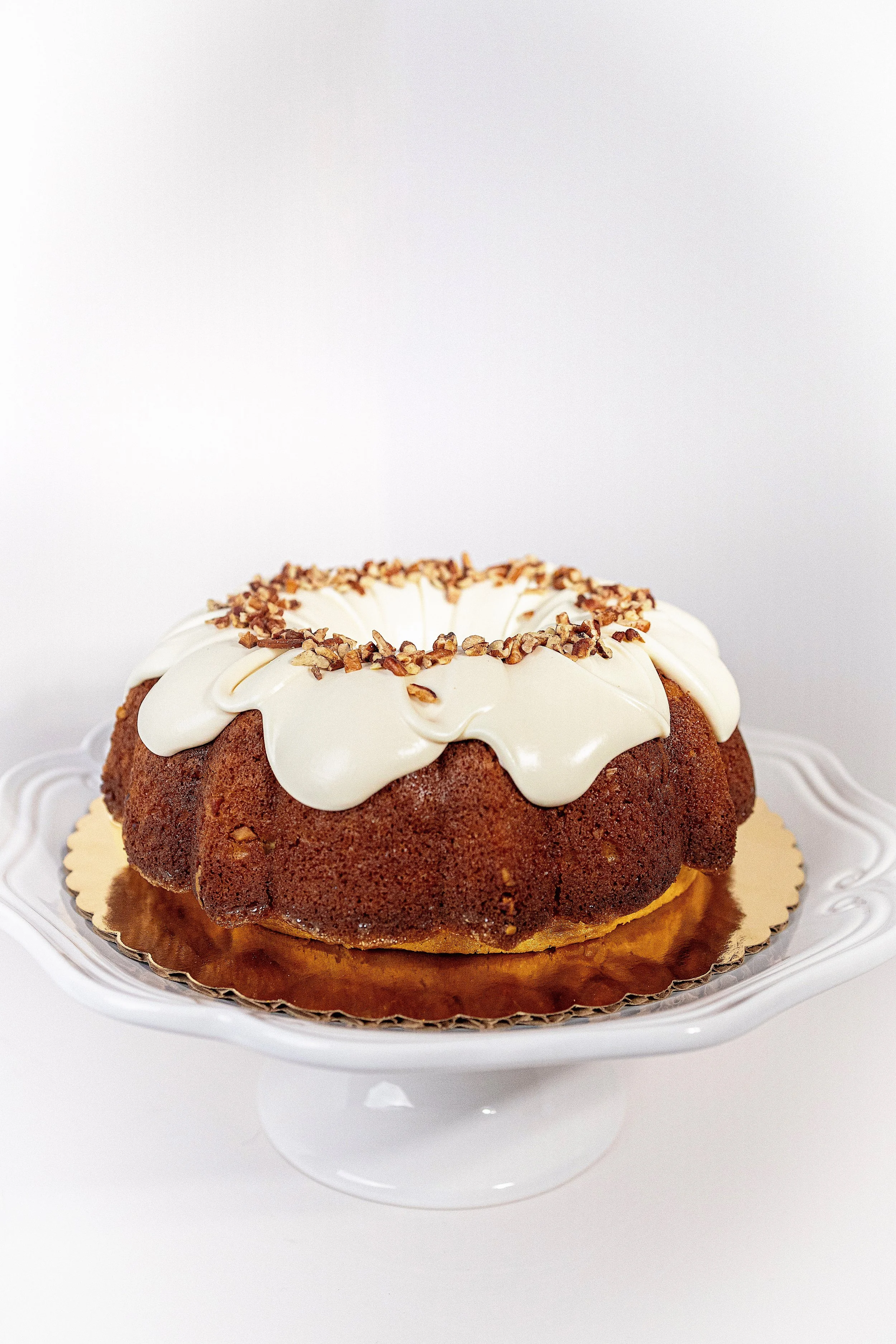 Spiced sweet potato cake with a crunchy pecan crust, finished with cream cheese icing for the perfect blend of smooth and nutty.