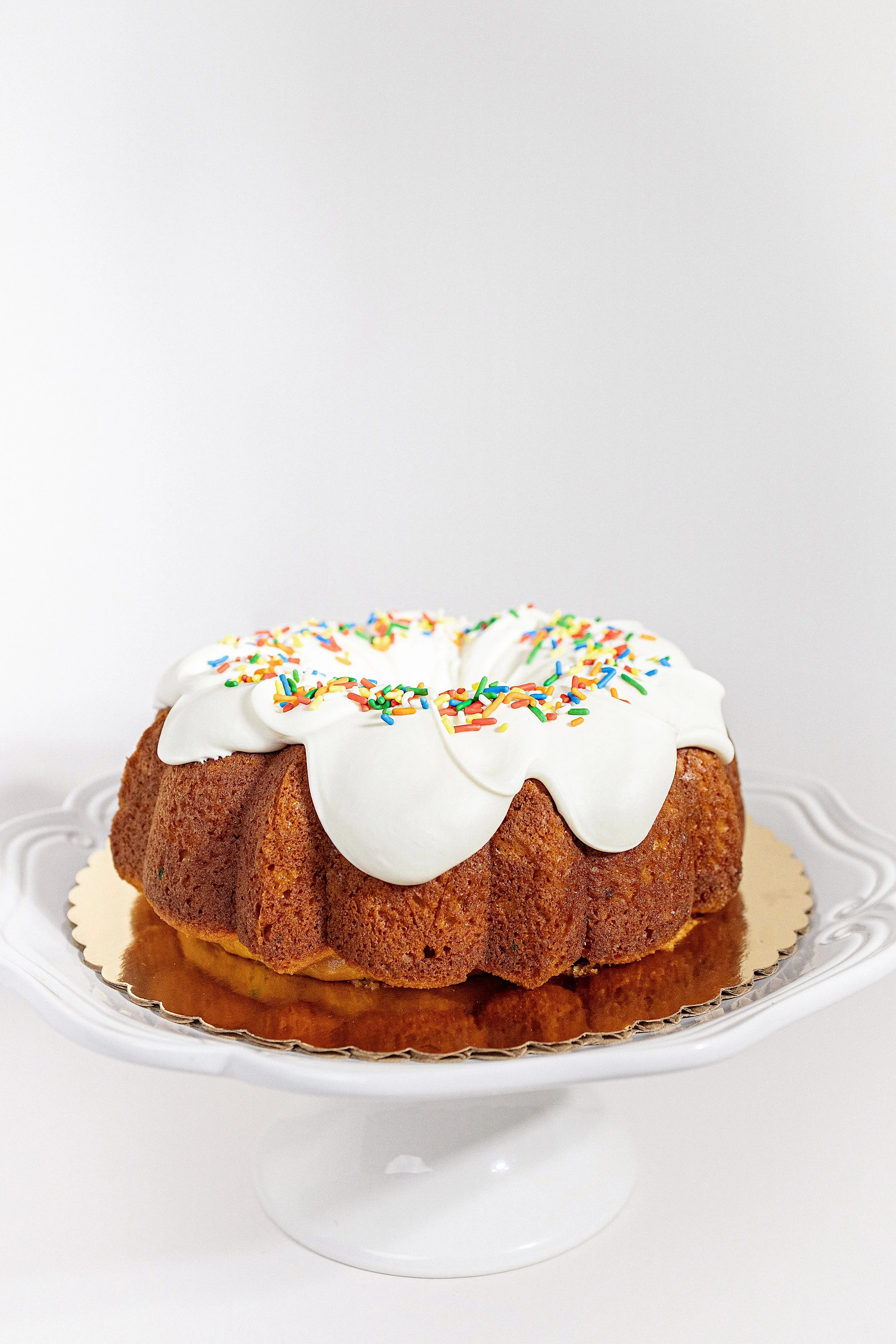 Classic vanilla cake bursting with colorful sprinkles, topped with swirls of creamy vanilla icing and a playful dash of even more sprinkles