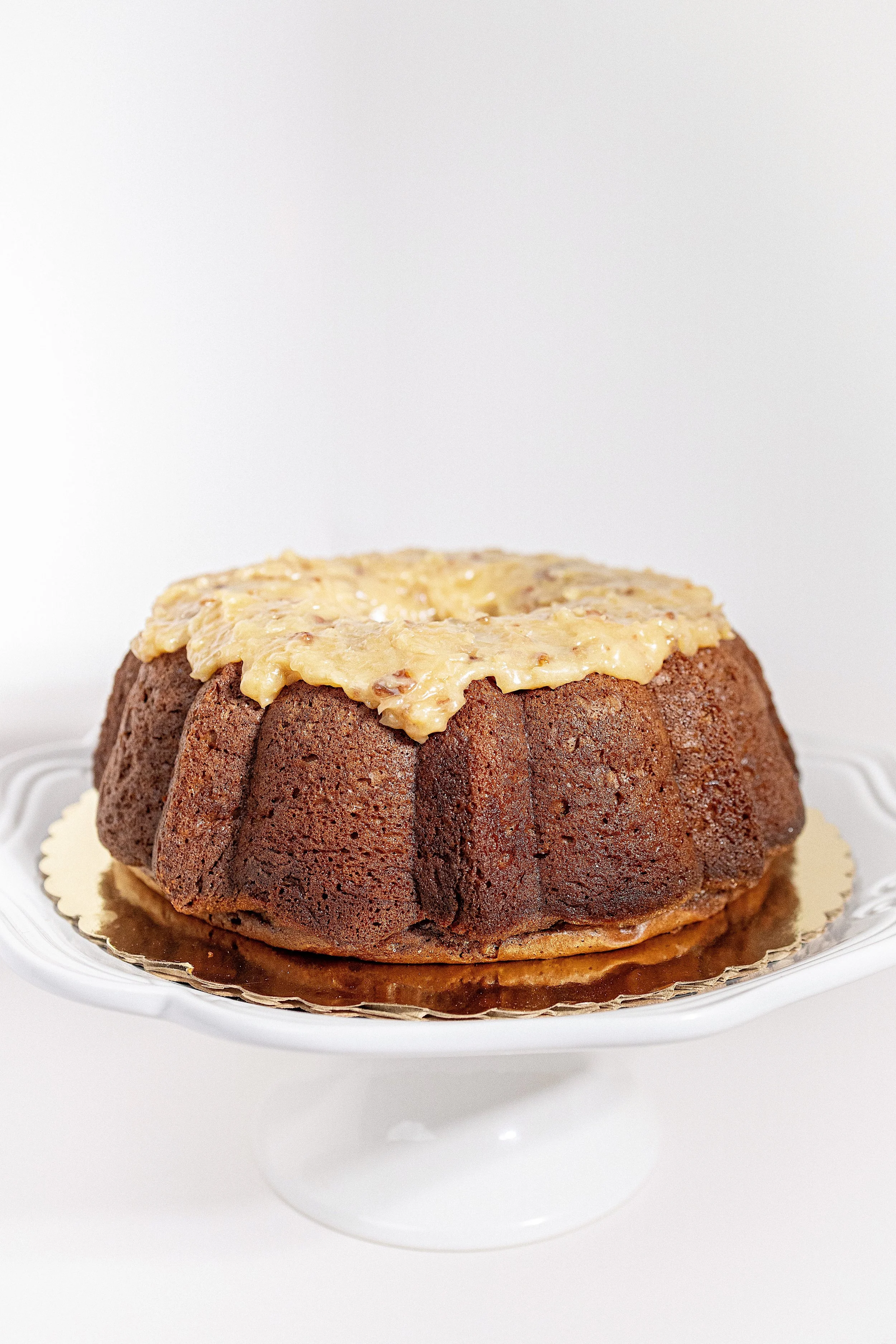 Decadent chocolate cake topped with coconut-pecan frosting perfection.